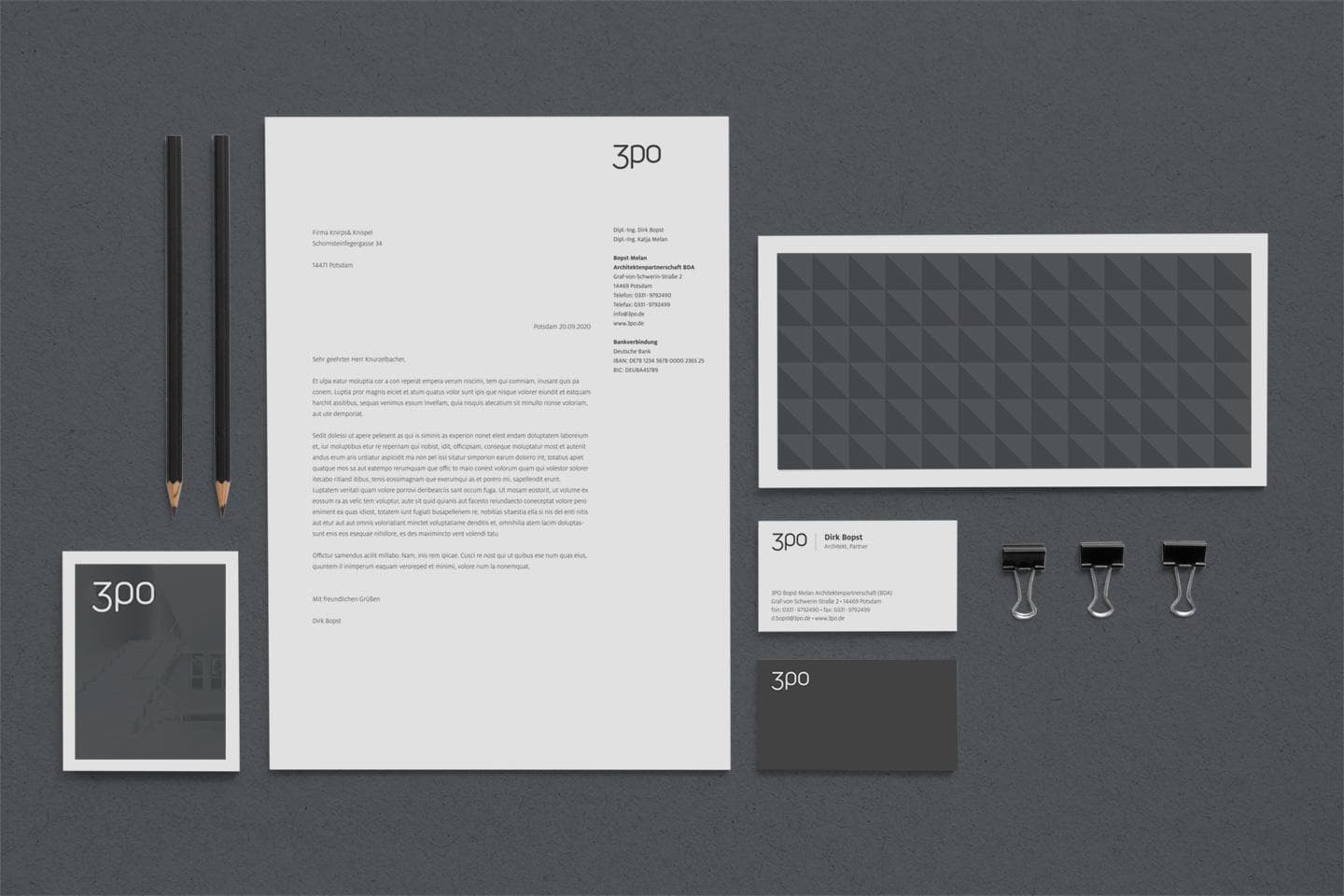 Die Potsdamer Architekt:innen Dirk Bopst und Katja Melan entwickeln mit Ihrem Büro 3PO eigenständige Architekturlösungen und versuchen, fernab von modischem Mittelmaß, die architektonischen Fragestellungen sensibel und intelligent zu beantworten. Das gilt sowohl für das Bauen im (z.T. denkmalgeschützten) Bestand als auch für Neubauten. Wir haben für 3PO Logo und Corporate Design erneuert und im Zuge dessen den Internetauftritt sowie sämtliche Printmaterialien neu gestaltet und umgesetzt.